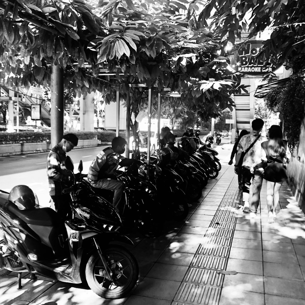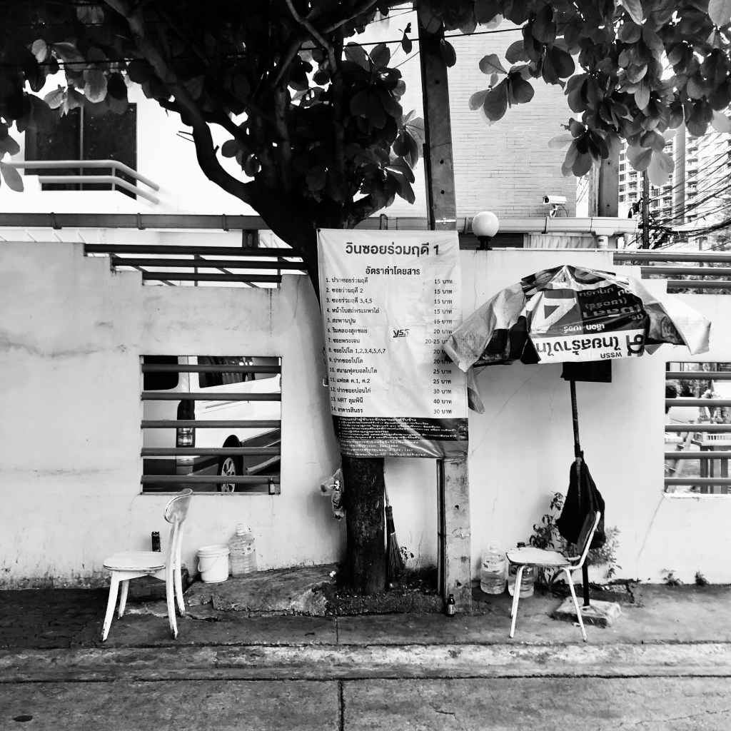 The motorcycle stand positioned at the right angle turn on my soi is a modest affair. There is one rather lonely tree that provides partial shade, until the annual city-wide tree branch pruning occurs, whereby the tree is then festooned with ropes that attempt to hold up a temporary and largely ineffectual tarpaulin roof. Sometimes a standing umbrella or two appears. There are a couple of eclectic chairs that have been donated by somebody in a nearby building. There are the reused PVC paint buckets with their lids (because they’re waterproof) serving as portable lockers for all manner of personal sundries in addition to standing in as makeshift alternate seating or foot rests. There are the large gallon-sized water bottles for the obvious reasons. On occasion, there are other people sitting there (women), who are obviously not motorcycle drivers who chat away, eat snacks and seem to just be there to keep the drivers company — most likely maids from some of the nearby residences that populate my soi.