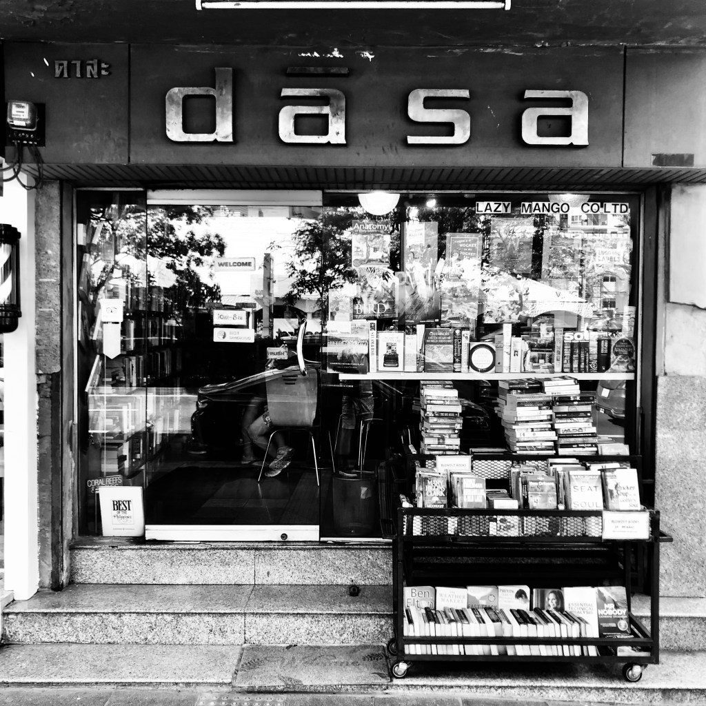 Walking in Bangkok involves many distractions —from construction sites to street vendors, from uneven paving to hanging wires and oddly leaning power poles, not to mention the cars, motorcycles and carts of all variety that populate the footpaths. Being aware of them and necessarily having to avoid them can result in you inadvertently crossing a soi you were supposed to turn into, as I did over a decade ago. It was not long before I realised my mistake, but as I turned to head back towards the soi I was meant to turn into, I noticed a trolley neatly stacked with piles of books in front of a narrow shopfront with a name that intrigued me. Dāsa, is a second-hand book shop located between on Sukhumvit, between Soi 26 and Soi 28. For the past 18 years it has played a role in meeting the niche demand for quality pre-owned English language books.