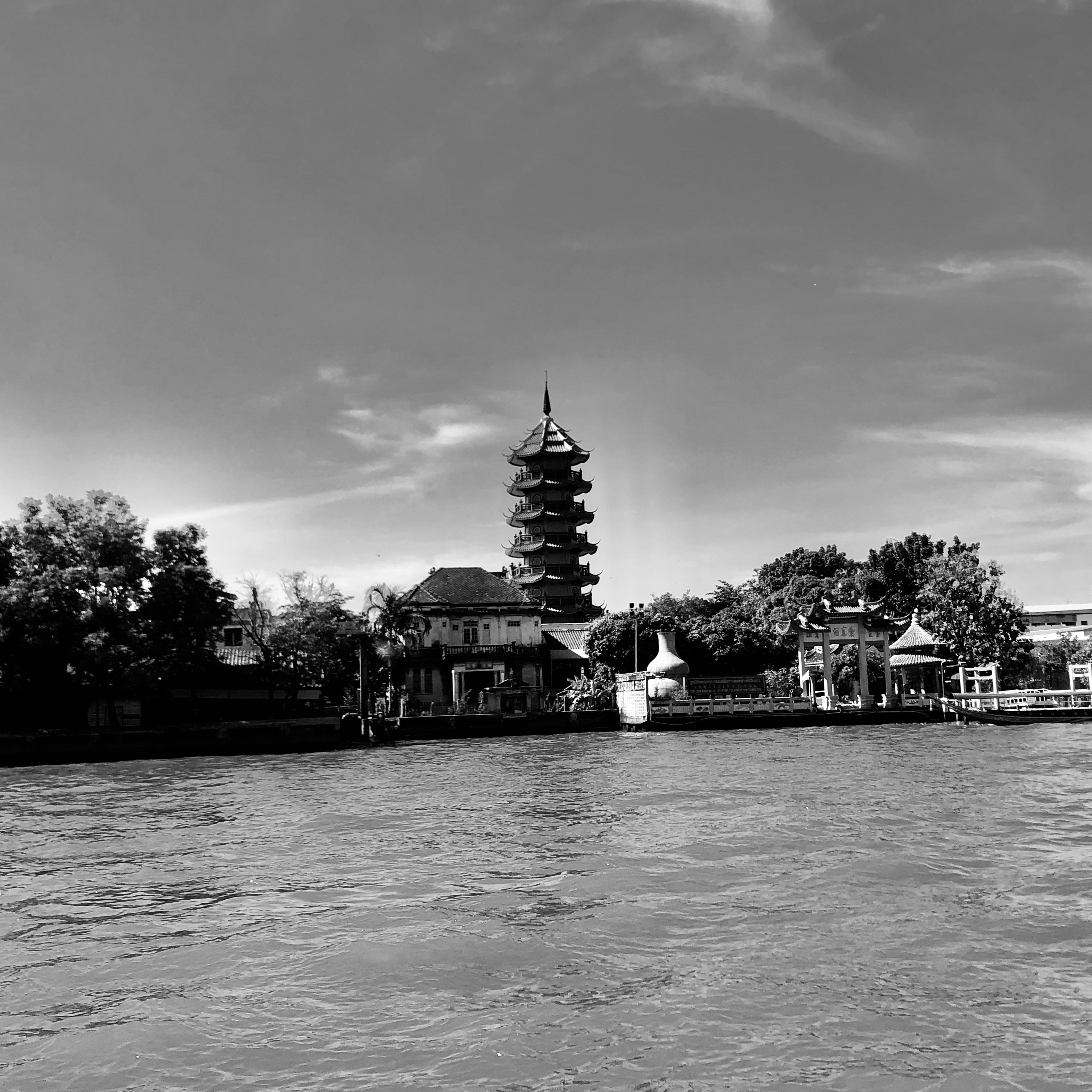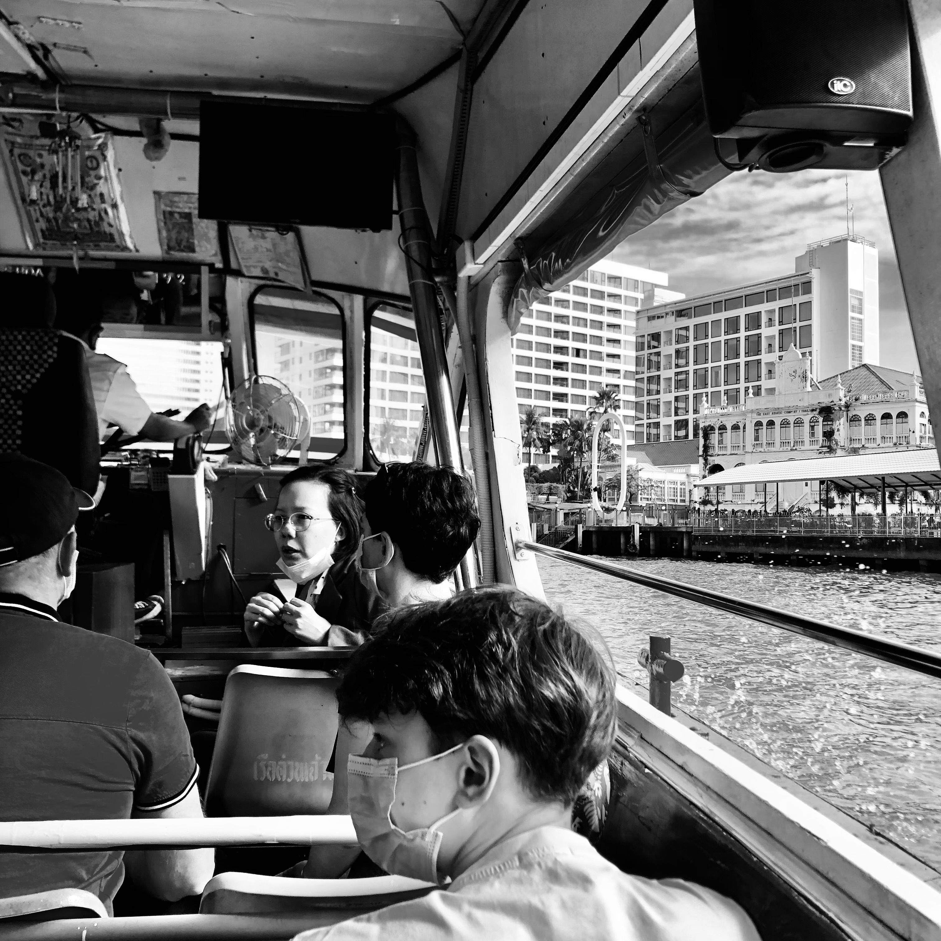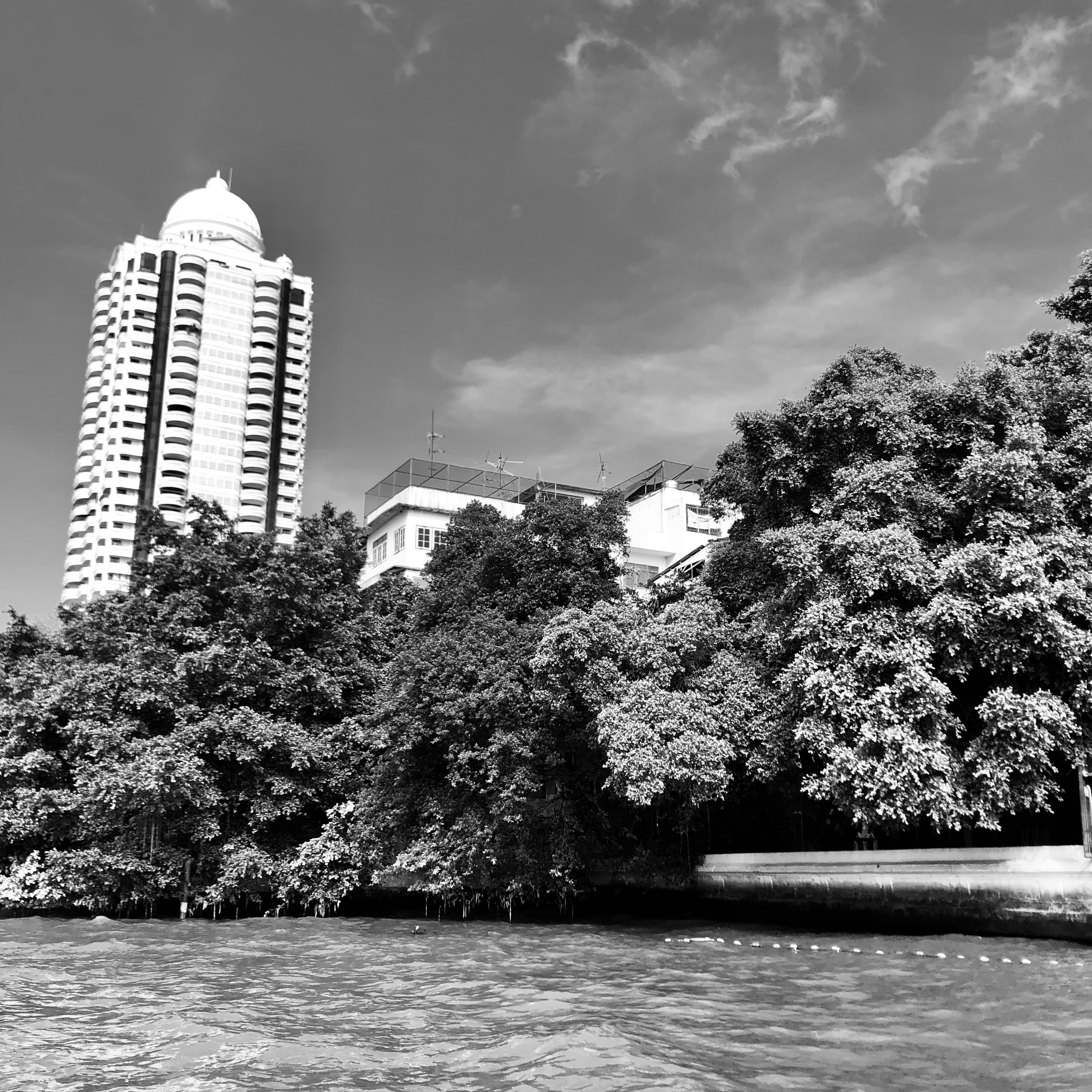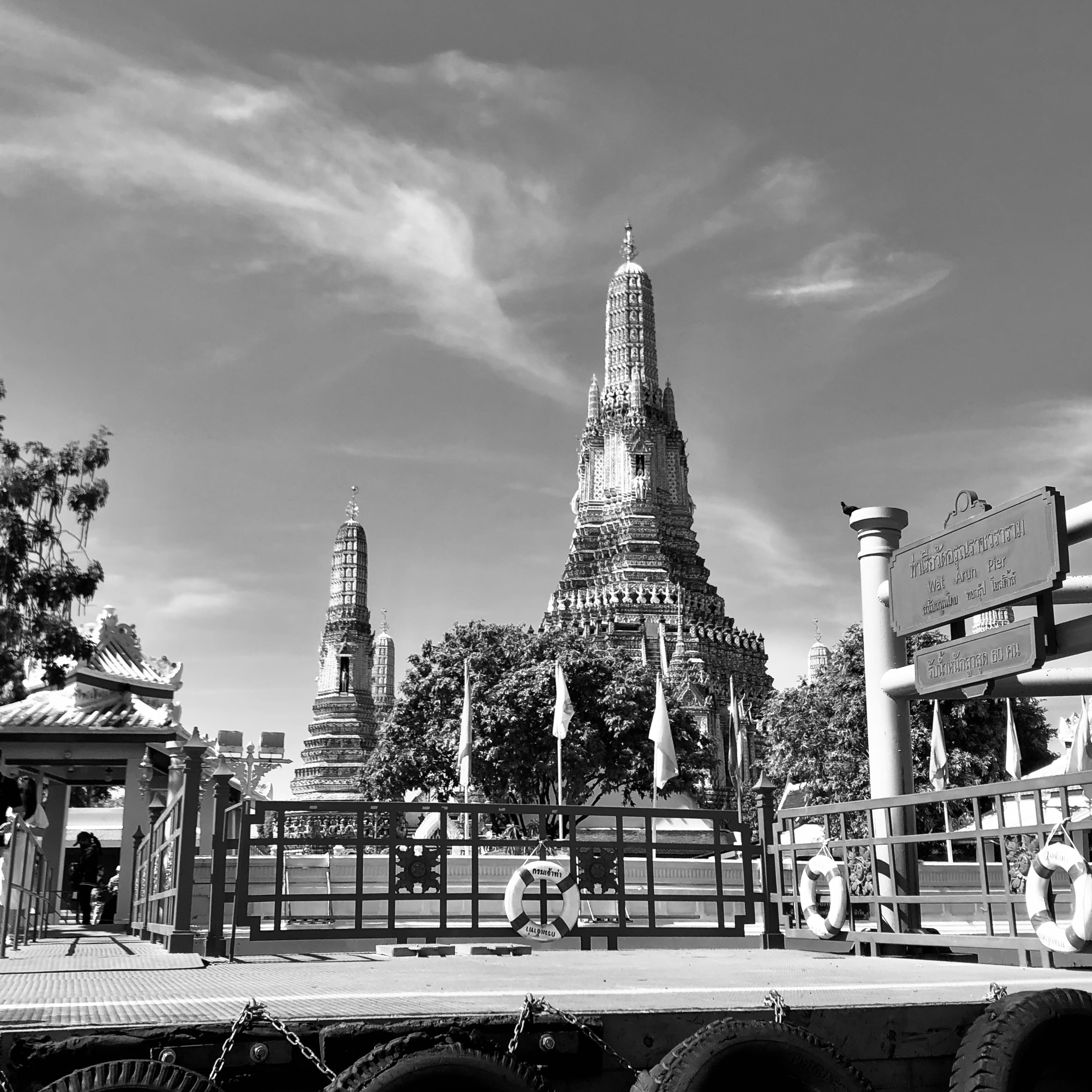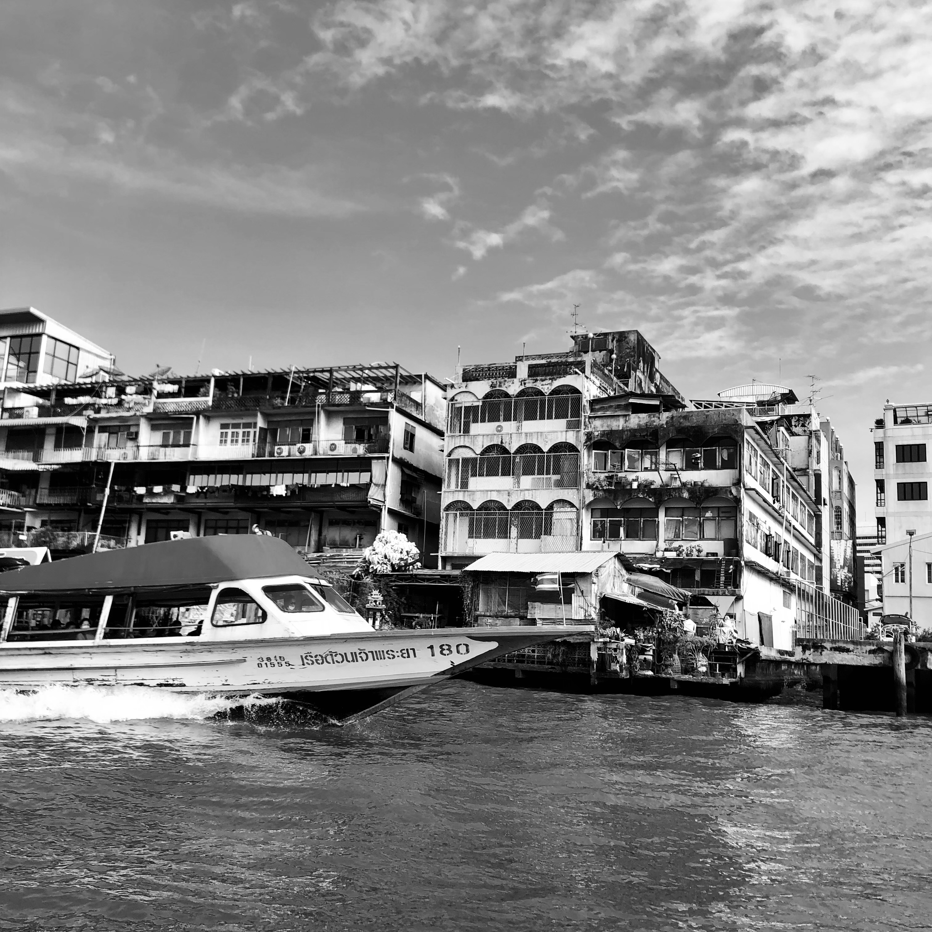 To ride on the Chao Phraya Express Boats is to experience an older, more engaged form of travel — one where we are less sheltered from the elements, less buffered from the comforts that cocoon us so effectively in today’s world. At the same time, all our senses are lavished with sights, sounds, smells and the sheer physicality resulting from the movement and vibration of these hulking and heaving vessels. There are no shortages of pagodas, stupas, domes, minarets, spires or dragon-tiled rooftops representing every major religion and their accompanying communities. Architectural styles both grand and grim — towering, glass and steel testaments to the titans of commerce and developement, glorious royal edifices, government ministries set against the most squalid of riverside tenements, lush gardens and commemorative parks, bustling riverside markets, dockyards, hospitals, universities, elegant mansions, gleaming high rises, bridges monumental in style and name, and the entire grand bazaar of life that still vividly, vibrantly, even stubbornly continues to populate both sides of the river embracing and fighting progress at the same time.
