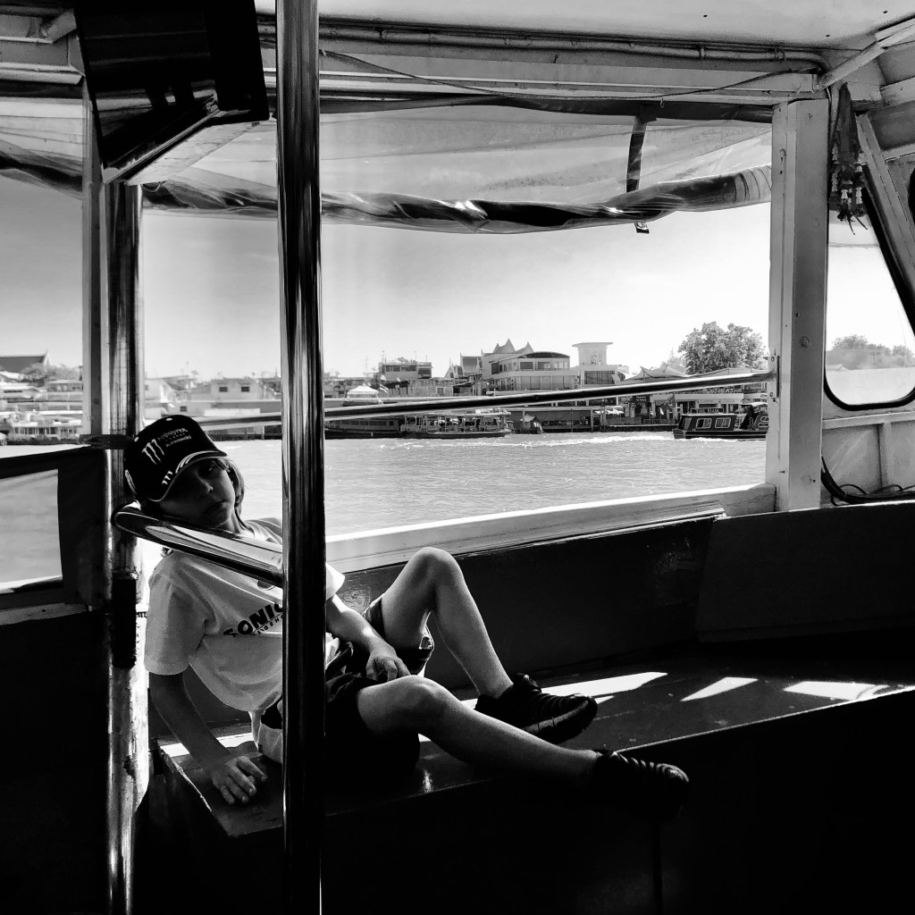 Then there are the people — Bangkok comprises a cosmopolitan and dynamic populace, awash with tourists and migrants. For within the potpourri of people that tumble in and out the ferries at each stop, you are likely to see a wide cross section of society, both local and foreign. There are the office workers and students with their sensible day bags, heads firmly planted downwards looking at their smartphone screens, earphones plugged in (with noise reduction these days) and trying their best to inure themselves as much as possible to the daily grind of commuting. There are the tourists, some with rucksacks so large they give you cause to worry of some impending weight imbalance on the vessel. There are dreamers and travel optimists of many sorts (myself included) who ceaselessly marvel at the carnival of external stimuli that pulsates on either side of the boat. There are those who have their favoured spots — some standing, some sitting, some on the left and some on the right, some at the front, or some at the rear, some seeking the sun, others seeking the shade. There are cosmetic pretties, ever-lost hippies, budding photo journalists, social media mavens, cash toting Ah-Mahs, shell-shocked veterans, multi-lingual guides and their flock, representing a multitude of nationalities. Often, you hear words like Siam, ‘The King and I’, Grand Palace, Temple of Dawn, and Reclining Buddha spoken, frequently tinged and twisted by varying accents and dialects.