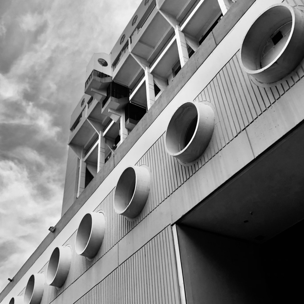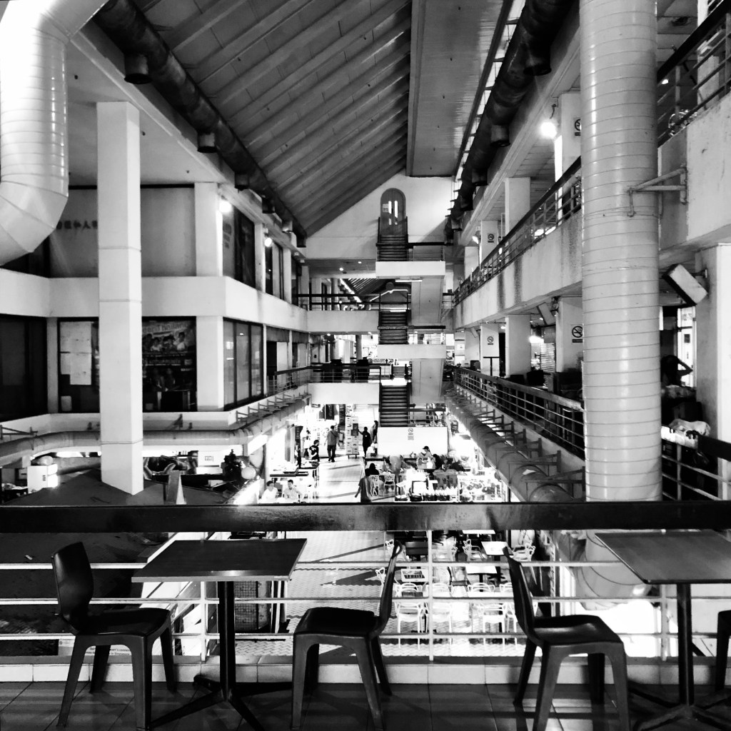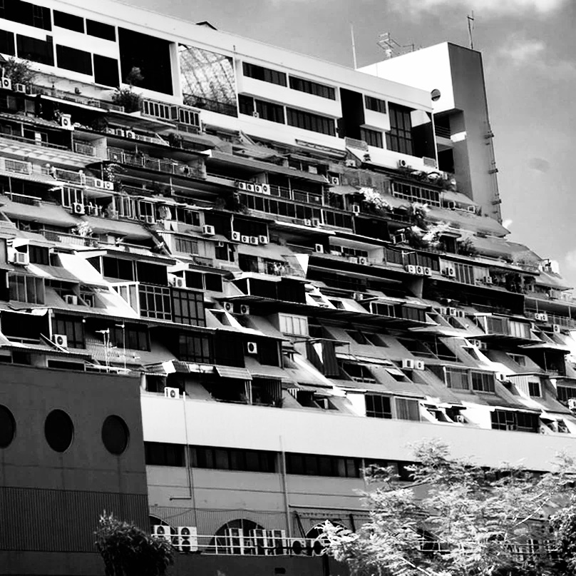 From it’s Beach Road entrance, enormous round windows on the lower and upper floors (as well as some support elements) are brightly clad in yellow, evoking an unmistakable nautical theme. In the building’s midsection, visibly staggered levels recess inward, reminiscent of the underbelly of stadium seating. All this adds to the building’s enormous sense of heft. When viewed from the Nicols Highway side of Golden Mile Complex, I couldn’t help but think of an old Olivetti typewriter I once had. In contrast to the wall of frontage looming on Beach Road, this side of the building comprised entirely of gently sloping terrace balconies covered with an obsessive compulsive’s nightmare of ad hoc extensions and mismatched add ons, brimming with multicoloured corrugated roofing — those would be the keys of my aforementioned typewriter. Try as I might to paint a rosey picture, the harsh truth is the building has not been sympathetically maintained — time has not been kind, especially in the context of Singapore. Designed in the waning days of the Brutalist period, looking at the building now, only one appropriate adjective came to my mind: brutal, punishingly harsh and uncomfortable, lacking in any attempt to disguise unpleasantness. That being said, if Golden Mile Complex were located in Bangkok, no one would bat an eyelid.
