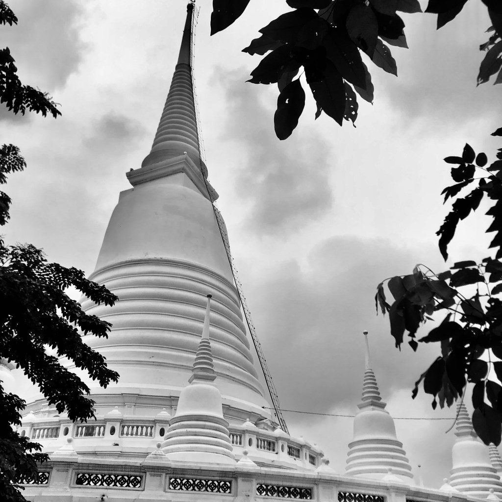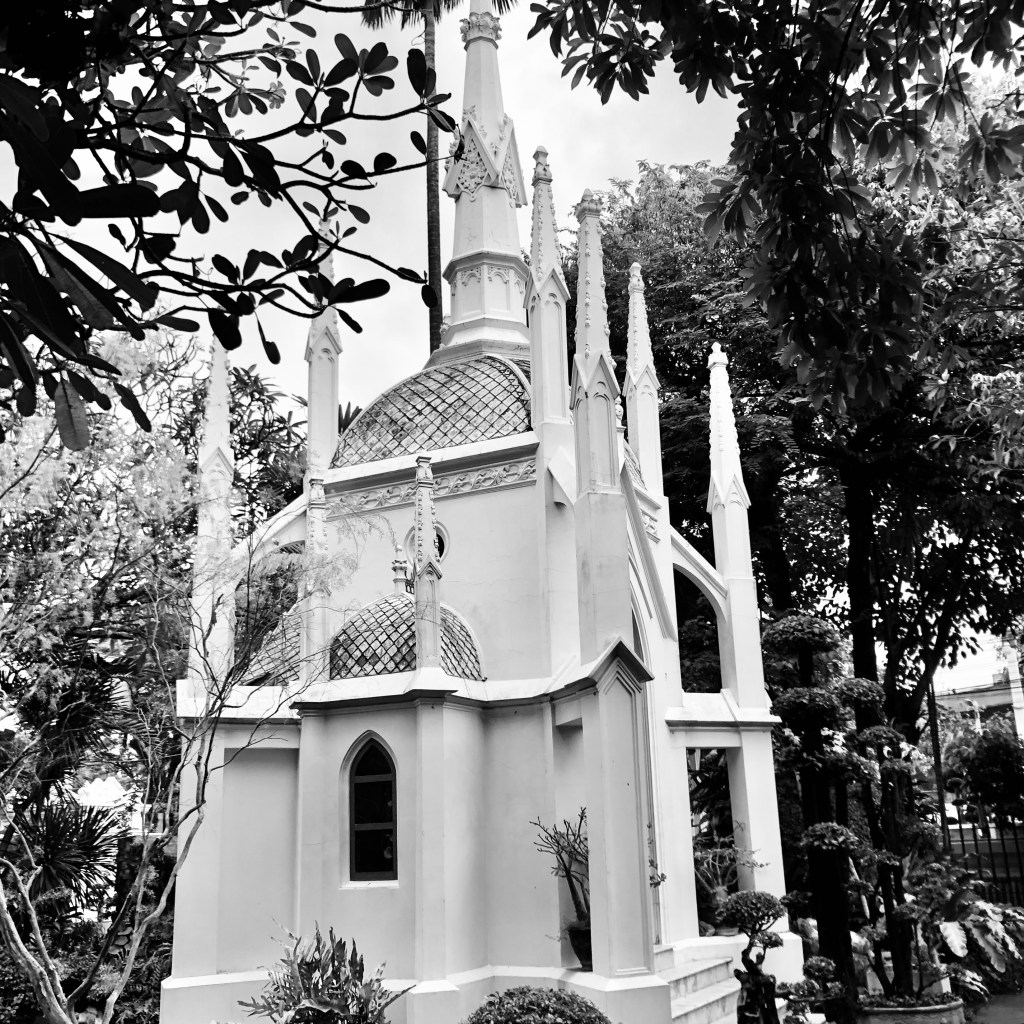 Near the foot of Bangkok’s majestic Memorial Bridge on the Thonburi side of the Chao Phraya River, a thin, gleaming white spindle of a spire soars over 60 meters atop an elegant bell-shaped stupa, surrounded by 16 smaller, equally colourless and identically shaped constructions. Visible from across much of the nearby vicinity, the Maha Chedi (or Great Pagoda) of Wat Prayoon — in its hue and arrangement — is something of a minimalist anomaly in a city sprinkled with thousands of shimmering polychromatic religious structures. What is less visible nearby, in the shadow of the temple’s monumental Chedi, is a mythical world in miniature, a tiny stage-set Jardin built by one of Thailand’s most influential families and home to a memorial commemorating a calamitous explosion, resulting in the kingdom’s first modern surgery — one of the myriad of secrets hidden within the walls of this beguiling complex.