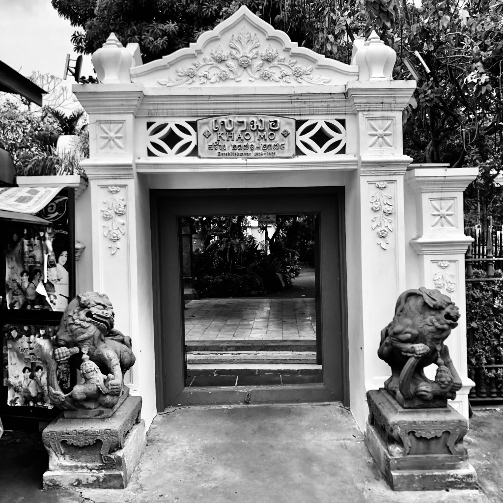 The colour itself wasn’t the only thing that I found incongruous about this fence — a barrier that looked like it would be more at home along the Thames near the Tower of London, rather than within sight of the Chao Phraya River in the middle of Bangkok. The decorative elements repeated along its visibly rusting length are fashioned after antiquated weapons: axes, swords, lances and arrows. Peering through the iron rails I caught glimpses of what looked like gilded architectural flights-of-fancy scattered atop a fantastical rock formation rising out of a pond — reminiscent of those depicted on Chinese or Japanese ink scrolls. Like a bird distracted by shiny objects, I momentarily put aside my plan to see the Great Chedi and followed my inner sneaky beaky, making a beeline to find out what was behind the enclosure. What awaited me was a Lilliputian haven screened off from the outside world. To enter this sanctuary within a sanctuary, I passed through heavy wooden red doors underneath a sign with the words “Khao Mo, Establishment 1828 – 1835” elaborately carved on it. Once inside, like everyone else who entered, I ceased to be me and became a modern-day Gulliver.